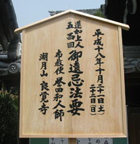 この度、良覺寺門徒一同の懇念が実を結び蓮如上人五百回御遠忌を厳修する日をここに迎えました。この勝縁に出遇わせて頂くことは、この上ない慶びでございます。本日まで、法要準備にために御尽力を賜りました有縁の皆様に衷心より感謝し、厚く御礼申し上げます。 蓮如上人が生きられた室町時代は、正に時代の過渡期でありました。幕府や朝廷の権威は地に落ち下克上がはじまります。それに伴い大小の戦乱が絶え間なく続き、加えて天災が人々を襲いました。倫理も道徳も破壊され、人々は自分が何のために生まれ、何のために生きていくのか分からぬまま死なねばならない。そういう時代でした。 生の拠り所を見出せないまま迷い惑う当時の人々に、蓮如上人は、親鸞聖人が顕かにされた真宗を「雑行を棄て、一心一向に阿弥陀仏をたのめ」と端的に表現し人々にお伝え下さいました。まるで地を這う虫のように時代社会から見捨てられ、自分自身で自分を見捨てていた人々に、人間をはかる全ての価値観を棄て、人間存在そのものの尊さを教えてくださったのです。そして、自分が生まれた意義、自分が生きる喜びを問うていく生き方が、ここにあることを説いて下さったのです。 我々が生きる今という時代も、また時代社会の過渡期であります。価値観は多様化し、人々は生の確かな拠り所を見失っています。生きるための手段ばかりに迷い、生きる目的を見出すことに目がいくこともありません。この時代社会にあって、蓮如上人が我々の先達に伝えてくださった浄土の真宗を今一度聞き直し、我々一人ひとりが自分自身の生まれた意義と生きる喜びを問うていく生き方を成就する深重の機縁であると、この御遠忌を頂いてまいります。 この度の勝縁に参詣頂きながら、準備不行き届きの点が多く、御迷惑をおかけしておりますこと、深くお詫び申し上げます。 本日はようこそお参りくださいまして、誠に有り難う御座います。 2006年(平成18年)10月21日 良覺寺住職 釋願證